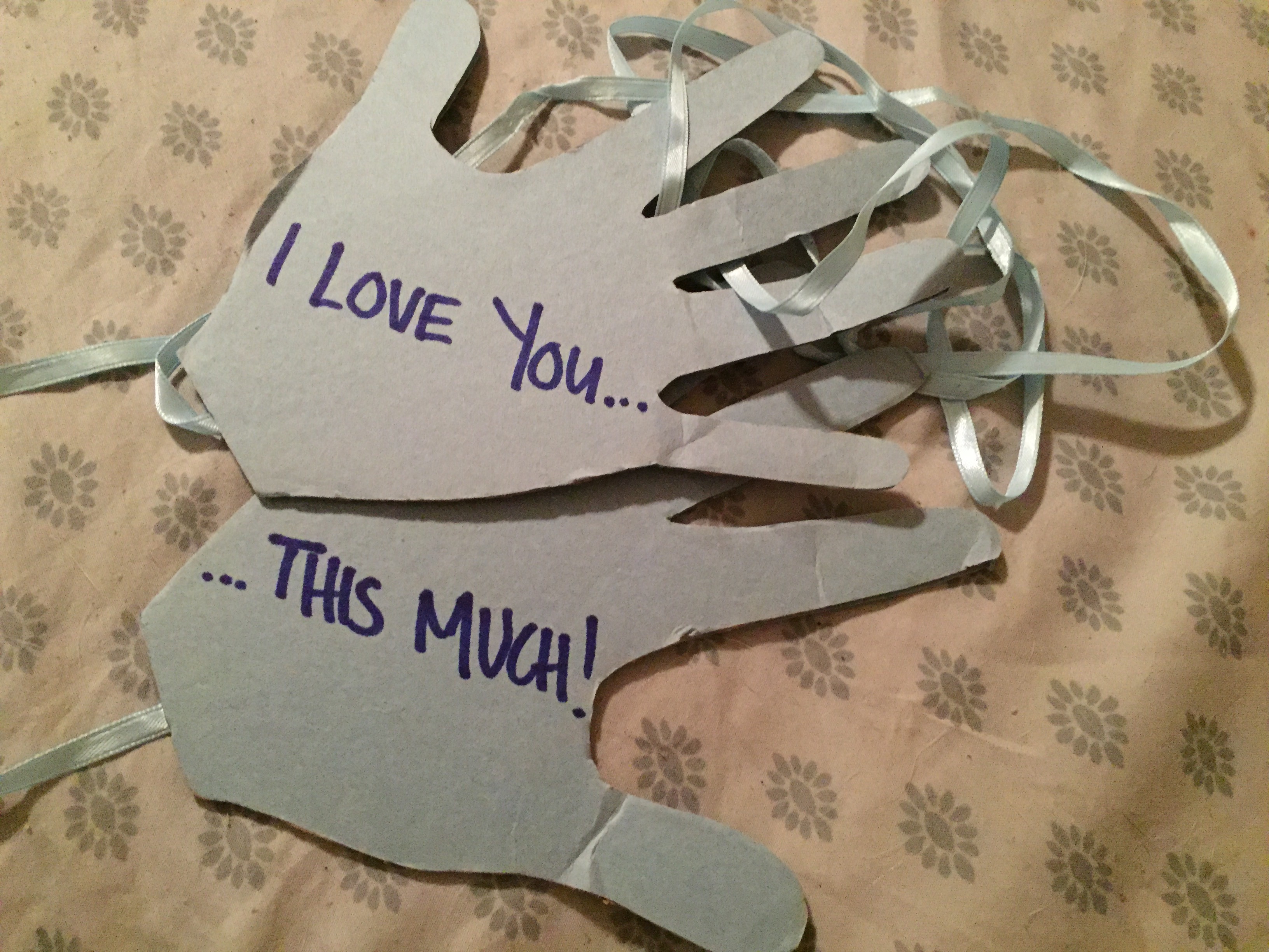 I love you <———————->In essence, it meant there was no measuring how much I loved him. It became our thing. Using that thought process I traced out my hands then glued it on some cardboard so it was steady. Tied string between the two hands long enough for him to stretch out comfortably. Wrote “I Love You” on one hand and “This Much” on the other. That way, he knew even eternity couldn’t explain how much he meant to me.