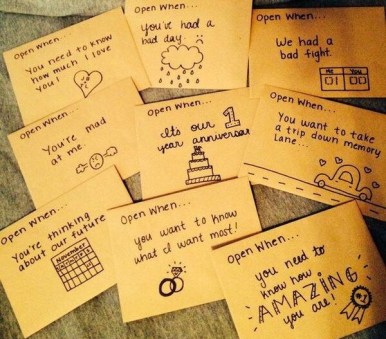 - Open When Letter.This one is one that I am currently working on for him. I’ve seen a ton of different variations for this. Currently I have 17 different letters I’ve written to him that he’s allowed to open during certain times. Examples would be: open when you get this, open when you need encouragement, open when you have doubt, open when you want to laugh. These letters are just other ways to let him know I adore him.